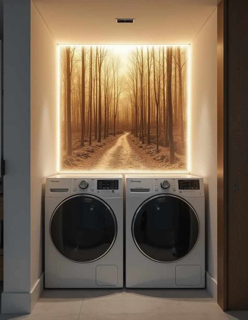 Práčovne, technické miestnosti či sklady bývajú navrhnuté čisto prakticky – veľa bielej, dlažba, spotrebiče, žiadny dizajn. Svetelný obraz sem dokáže priniesť farby, tepelný nádych aj atmosféru, vďaka čomu priestor nepôsobí tak stroho.