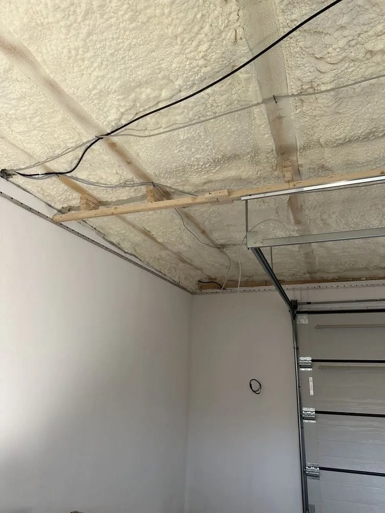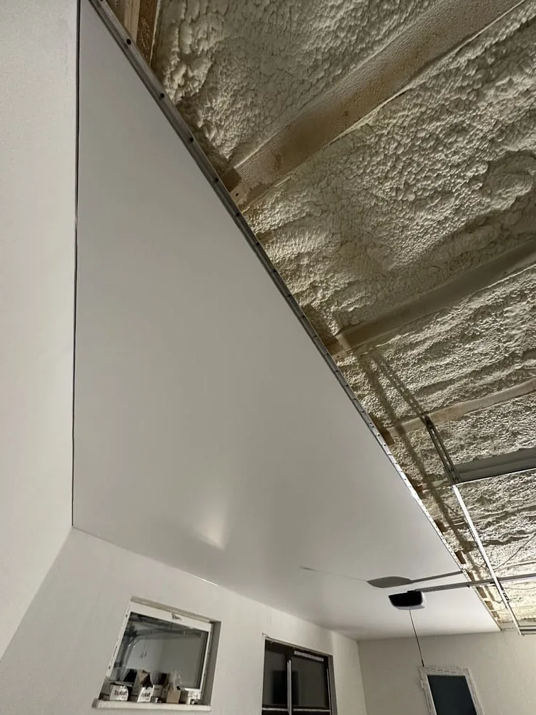 Po vytvrdnutí striekanej PUR peny sme pristúpili k príprave stropnej konštrukcie na aplikáciu napínaného stropu. Investor chcel, aby garáž pôsobila svetlo, prehľadne a moderne, a zároveň aby strop umožňoval bezproblémové osadenie garážovej brány. Hlavným cieľom teda bolo zabezpečiť, aby bol strop dokonale zarovnaný a zároveň kompatibilný s konštrukciou garážovej brány, ktorá mala byť osadená priamo do stropu bez akéhokoľvek narušenia dizajnu.