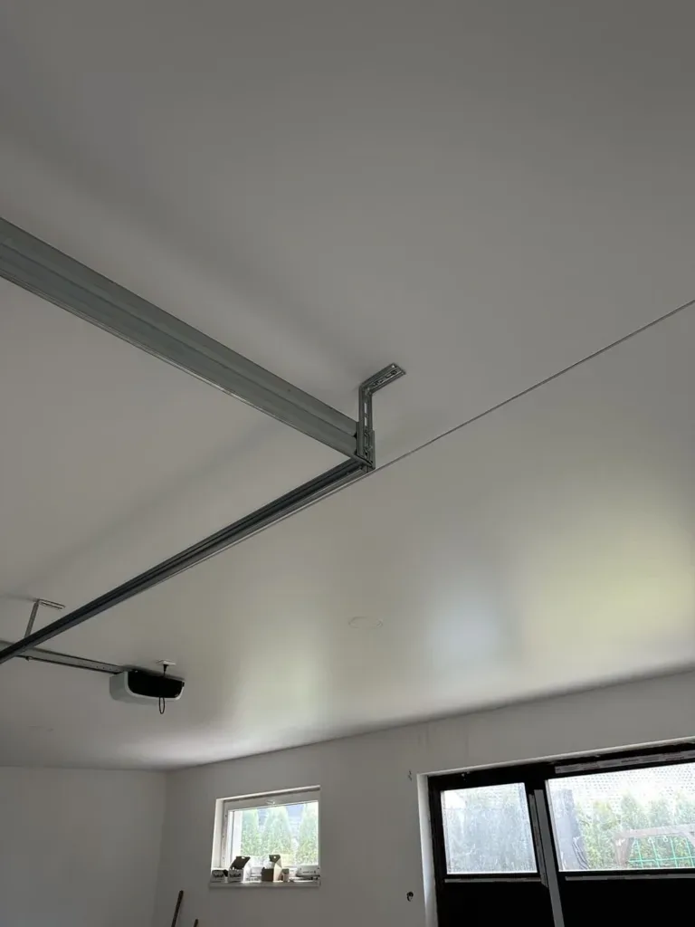 Montáž napínaného stropu prebehla rýchlo a čisto, bez nutnosti zdĺhavých stavebných zásahov. Súčasťou prác bola aj príprava stropnej konštrukcie tak, aby bolo možné bez problémov osadiť garážovú bránu priamo do napínaného stropu. Vďaka presnému prispôsobeniu konštrukcie a kvalitnej inštalácii fólie vznikol nielen esteticky pôsobiaci strop, ale aj technicky bezpečný a funkčný priestor.