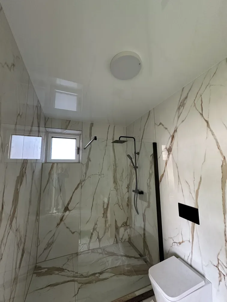 Pre finálny efekt sme zvolili lesklú fóliu, ktorá priestor opticky zväčšila a dodala mu moderný, elegantný charakter. Prisadené svietidlá zabezpečili rovnomerné osvetlenie a podčiarkli čisté línie stropu.