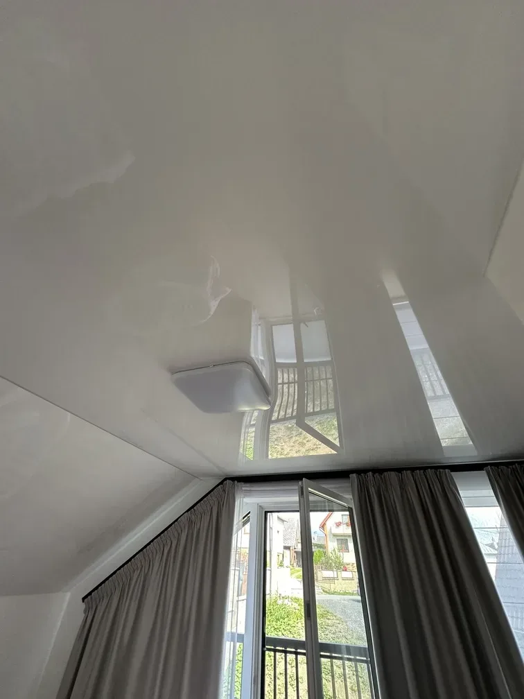 Pri montáži sme využili špecifickú techniku inštalácie napínaného stropu, kde bolo nutné kombinovať rôzne techniky inštalácie napínaného stropu na vodorovných, šikmých aj vertikálnych plochách, aby sa zachoval jednotný vizuálny štýl v celom podkroví. Lesklá biela fólia bola zvolená pre svoju schopnosť opticky zväčšiť priestor a zvýrazniť svetelné efekty, vďaka čomu interiér pôsobí moderne, otvorene a elegantne.