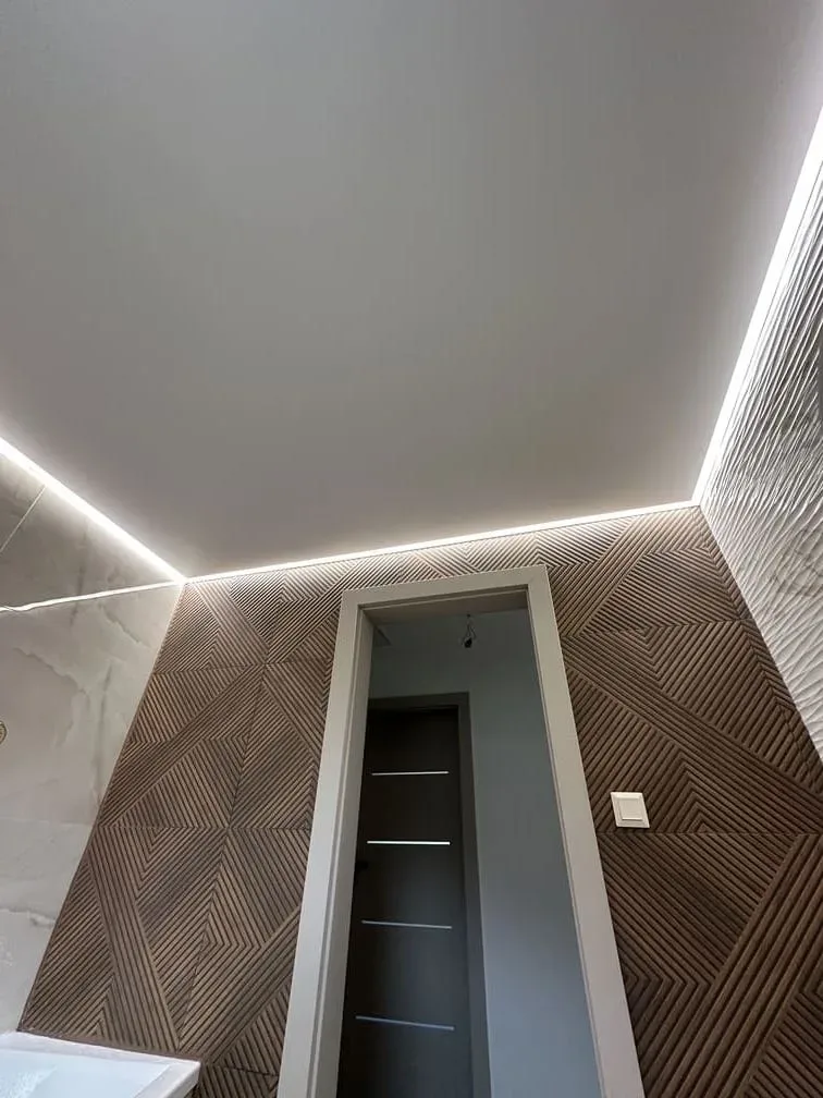 Ako finálny podhľad sme použili matnú fóliu napínaného stropu, ktorá zabezpečuje čistý a elegantný vzhľad. Matná povrchová úprava eliminuje odlesky a dopĺňa jemný efekt osvetlenia stien. Fólia je odolná, nenasiakavá a vhodná pre vlhké priestory ako kúpeľňa a toaleta.