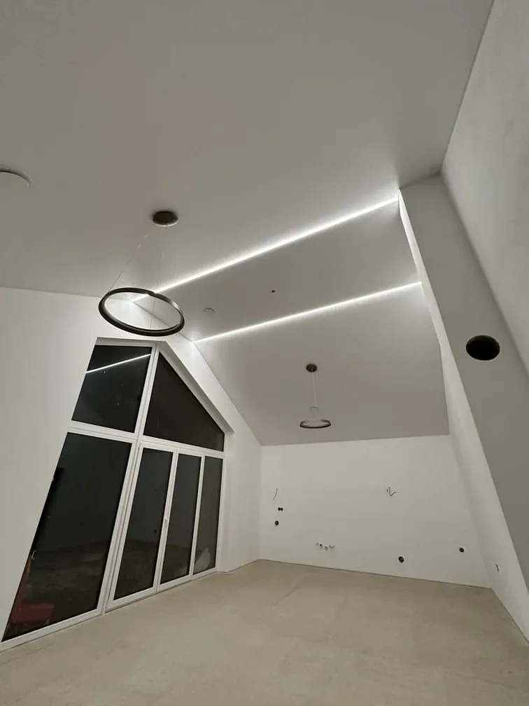 Realizácia pozostávala z dodávky a montáže napínaného stropu s bielou matnou PVC fóliou a integrácie lineárneho LED osvetlenia spolu so závesnými LED svietidlami. Montáž prebehla klasickým postupom s dôrazom na presnosť, rovnosť a bezpečné ukotvenie osvetlenia, bez potreby špeciálnych techník či zásahov.