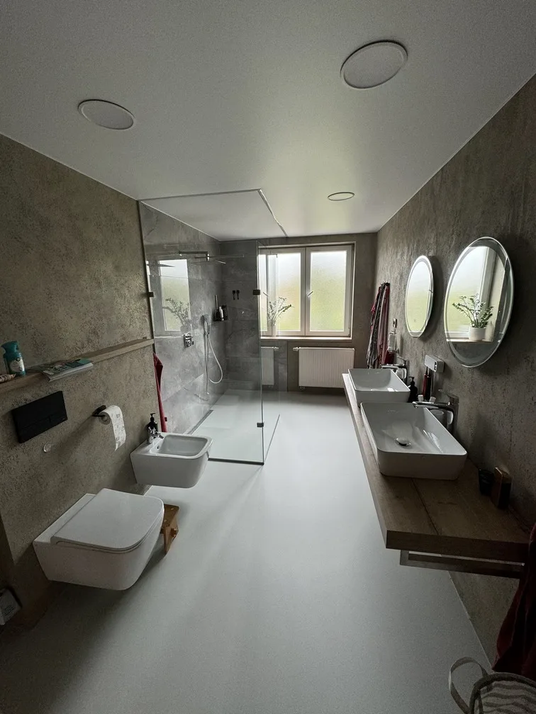 Špecifikom tejto realizácie bolo riešenie osvetlenia v kúpeľni, kde sme aplikovali svetelný strop s integrovanými LED panelmi, ktoré zabezpečili rovnomerné a príjemné osvetlenie celého priestoru. Konkrétne sme inštalovali svetelný strop s celoplošným LED podsvietením v sprchovom kúte, zatiaľ čo zvyšok kúpeľne je osvetlený prisadenými svietidlami, čím sa zabezpečilo rovnomerné a príjemné osvetlenie celého priestoru a zároveň vznikol moderný a vizuálne atraktívny efekt.